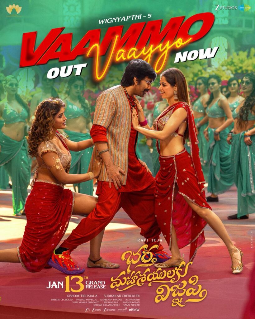 After the first two songs—each pairing Ravi Teja with a different heroine—received an enthusiastic response, “Vaammo Vaayyo” arrives as a full-throttle mass number that turns up the heat. Composer Bheems Ceciroleo delivers a vibrant, foot-tapping folk track driven by lively rhythms and celebratory beats. Adding a distinctive flavour is Swathi Reddy UK’s spirited vocals, whose texture elevates the song’s rustic charm.